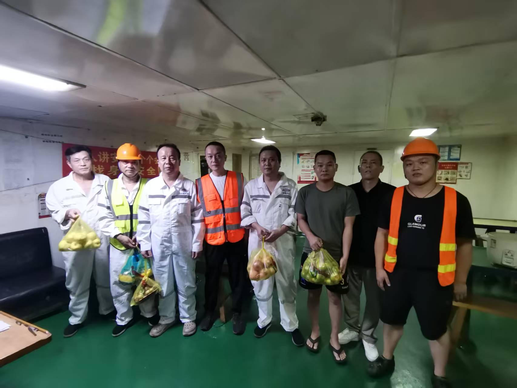 在船期間,莫經(jīng)理送上了水果,提前祝船員朋友們國慶、中秋佳節(jié)幸??鞓?。與船員們進(jìn)行了交流,了解了大家在船工作生活情況,叮囑船員朋友們時(shí)刻牢記安全、嚴(yán)格遵守安全規(guī)章、做好安全措施,確保船舶安全和人命安全,高質(zhì)量完成生產(chǎn)任務(wù)。船員們對公司的慰問表示感謝。
